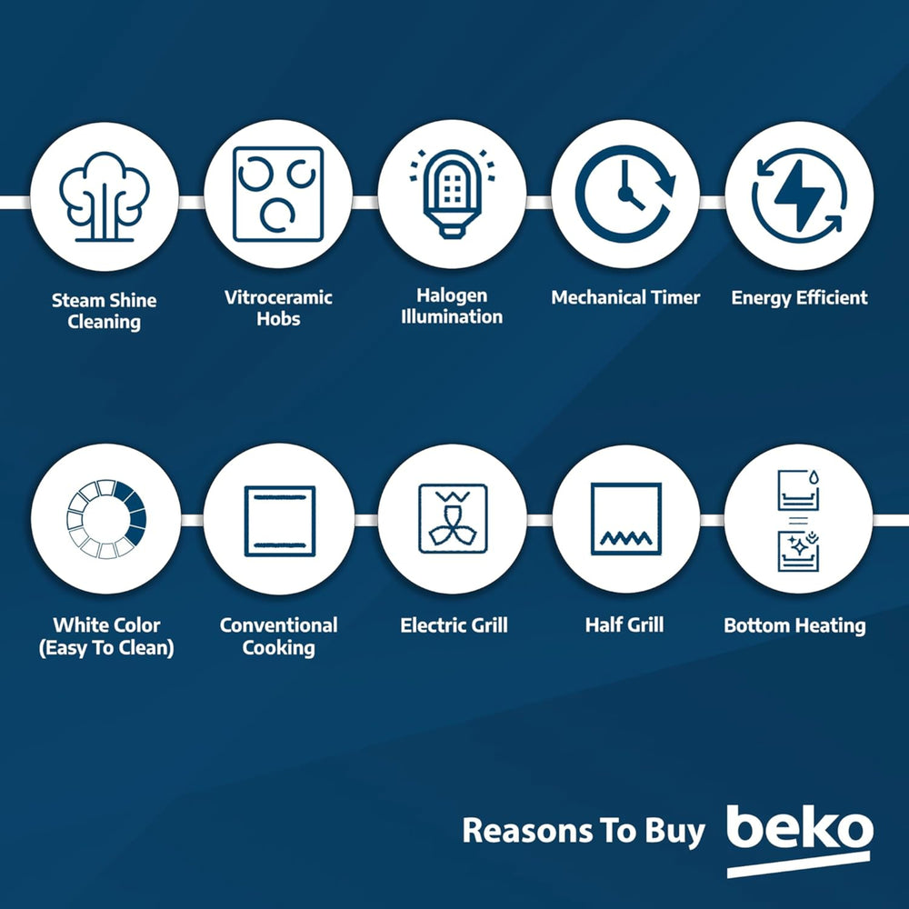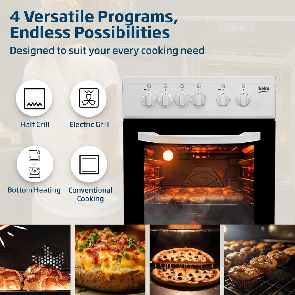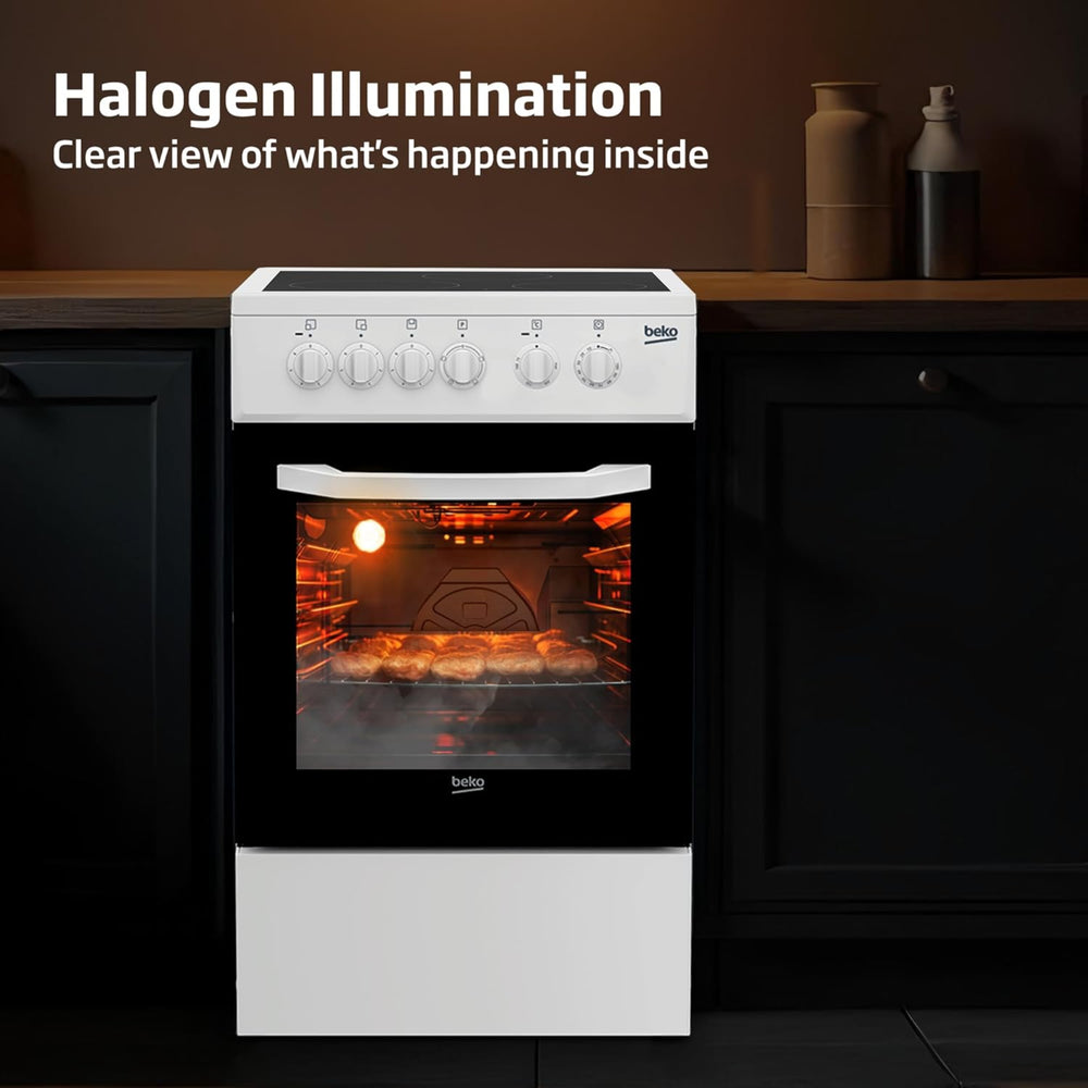 The Beko CSS48100GW Freestanding Ceramic Electric Cooker is designed for compact kitchens while offering versatile cooking performance. It features three ceramic cooking zones and a 54-litre electric oven, allowing you to cook several dishes at once. The oven includes four cooking functions, giving flexibility for baking, grilling and everyday cooking. With SteamShine® cleaning, the oven uses steam to loosen grease and food residue, making cleaning much easier. The cooker also includes halogen oven lighting, helping you monitor your dishes without opening the door and losing heat.