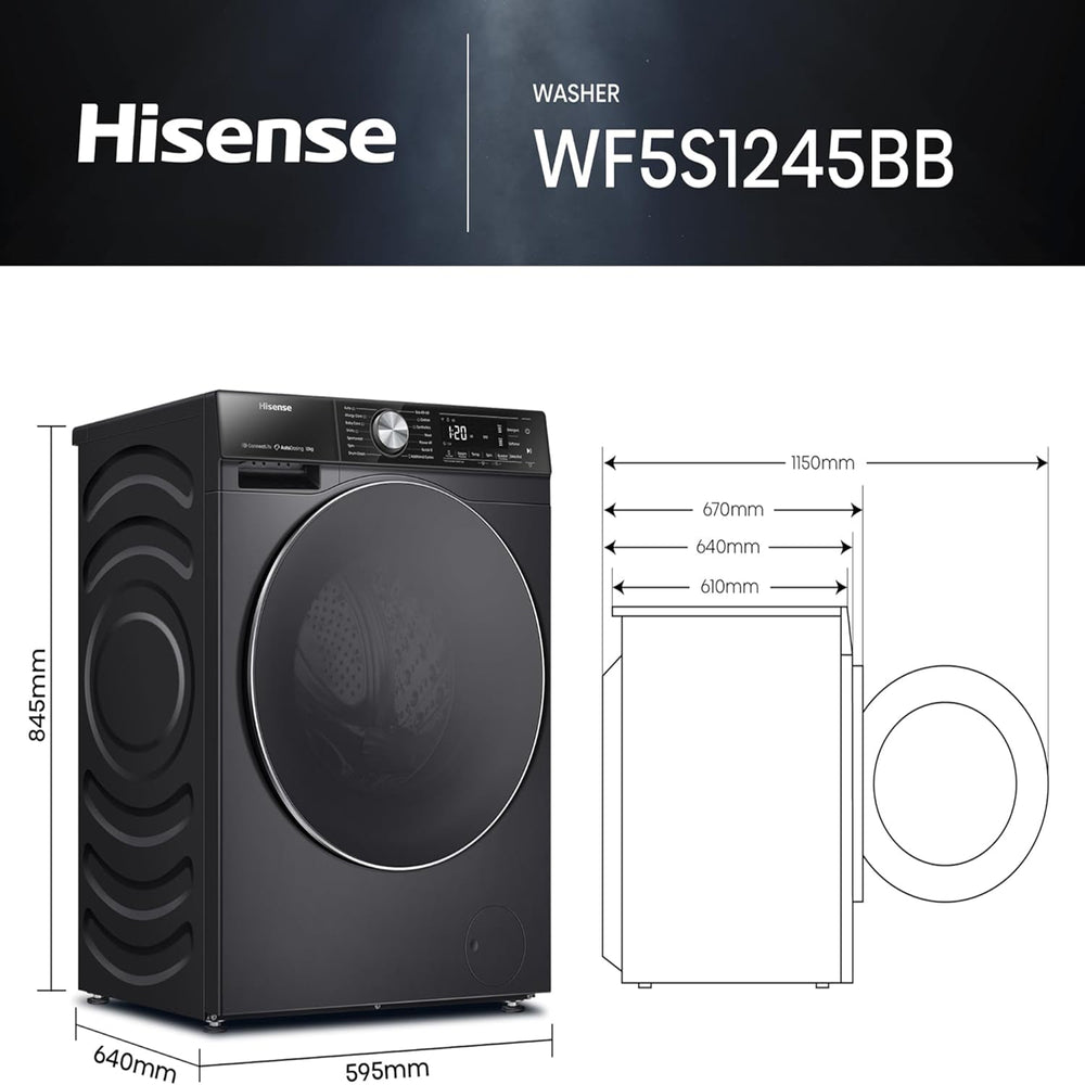 The Hisense WF5S1245BB Front Load Washing Machine is engineered for powerful, large-capacity laundry care with a generous 12 kg drum, making it ideal for big families and heavy loads. Its 1400 RPM spin speed efficiently extracts moisture to help reduce drying time.