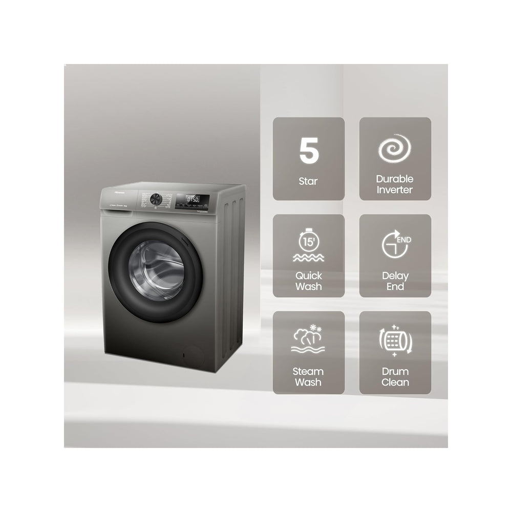 The Hisense WFQP8012T Front Load Washing Machine combines smart performance and reliable wash functions to make everyday laundry easier and more efficient. With 8 kg capacity and inverter motor technology, it balances power with energy savings and quieter operation. A wide range of 15 wash programmes, including Steam / Allergy Care and Quick Wash, allows you to care for various fabrics and soil levels while keeping clothes fresh and clean. Practical features like Pause & Add, Child Lock, and Delay Timer add usability and convenience. Finished in a sleek titanium colour with an easy-to-read LED display, this Hisense washer is a versatile choice for modern homes.
